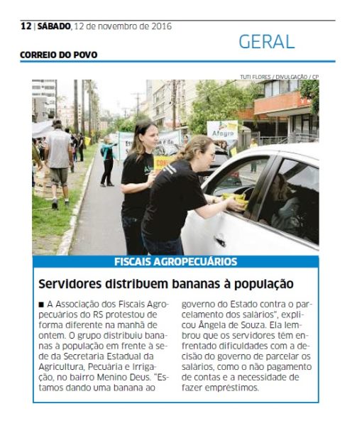 CORREIO DO POVO | GERAL | PÁGINA 12 A Associação dos Fiscais Agropecuários do RS protestou de forma diferente na manhã de ontem. O grupo distribuiu bananas à população em frente à sede da Secretaria Estadual da Agricultura, Pecuária e Irrigação, no bairro Menino Deus. “Estamos dando uma banana ao governo do Estado contra o […]