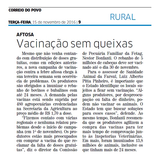 CORREIO DO POVO | RURAL | PÁGINA 9 Mesmo que não venha contando com distribuição de doses gratuitas, como em edições anteriores, a nova campanha de vacinação contra a febre aftosa chega à sua terceira semana sem ocorrência de problemas. Os produtores são obrigados a imunizar o rebanho de bovinos e bubalinos com até 24 […]