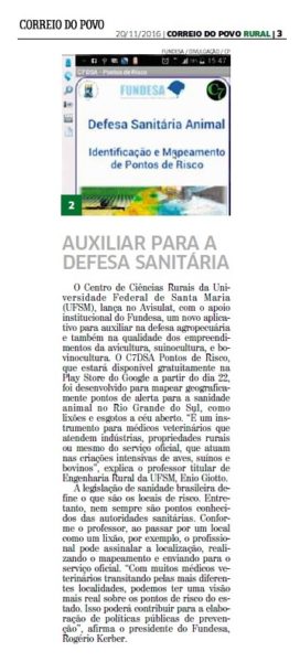 CORREIO DO POVO | CORREIO DO POVO RURAL | PÁGINA 3 O Centro de Ciências Rurais da Universidade Federal de Santa Maria (UFSM), lança no Avisulat, com o apoio institucional do Fundesa, um novo aplicativo para auxiliar na defesa agropecuária e também na qualidade dos empreendimentos da avicultura, suinocultura, e bovinocultura. O C7DSA Pontos de […]