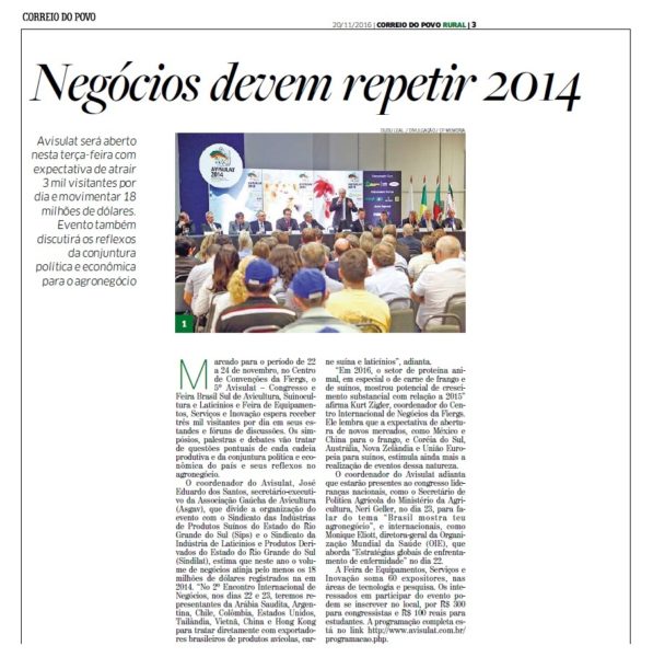 CORREIO DO POVO | CORREIO DO POVO RURAL | PÁGINA 3 Avisulat será aberto nesta terça-feira com expectativa de atrair 3mil visitantes por dia e movimentar 18 milhões de dólares. Evento também discutirá os reflexos da conjuntura política e econômica para o agronegócio Marcado para o período de 22 a 24 de novembro, no Centro […]