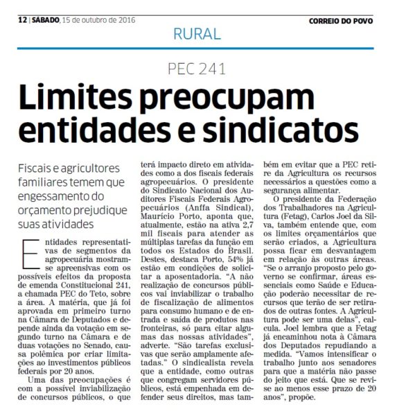 CORREIO DO POVO | RURAL | PÁGINA 12 Fiscais e agricultores familiares temem que engessamento do orçamento prejudique suas atividades Entidades representativas de segmentos da agropecuária mostramse apreensivas com os possíveis efeitos da proposta de emenda Constitucional 241, a chamada PEC do Teto, sobre a área. A matéria, que já foi aprovada em primeiro turno na Câmara de Deputados […]