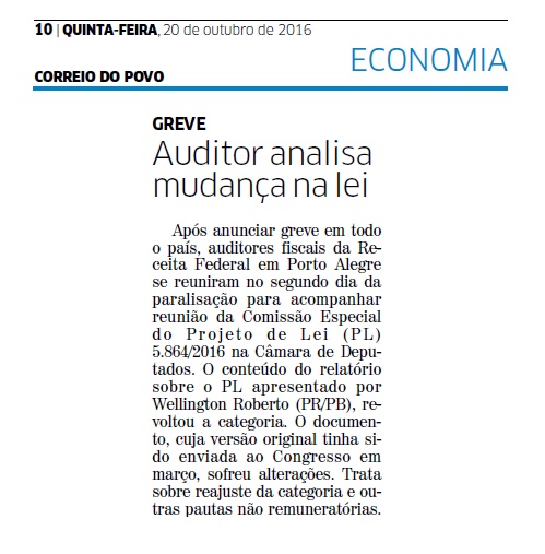 CORREIO DO POVO | ECONOMIA | PÁGINA 10 Após anunciar greve em todo o país, auditores fiscais da Receita Federal em Porto Alegre se reuniram no segundo dia da paralisação para acompanhar reunião da Comissão Especial do Projeto de Lei (PL) 5.864/2016 na Câmara de Deputados. O conteúdo do relatório sobre o PL apresentado por […]