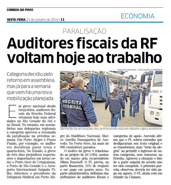 21/10/2016 – CP: Auditores fiscais da RF voltam hoje ao trabalho