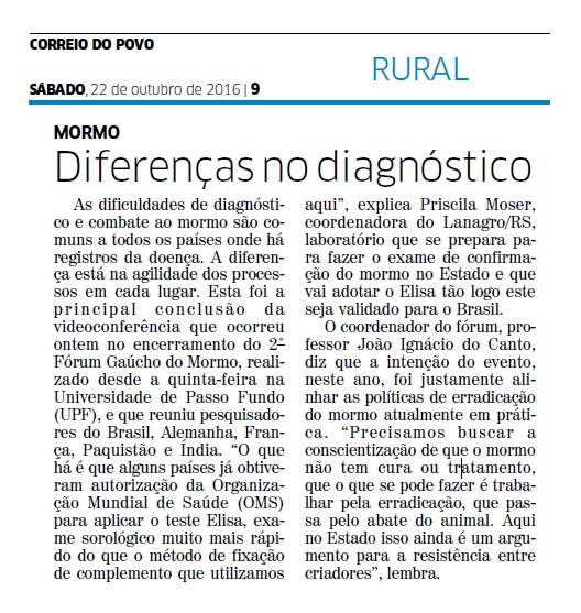 CORREIO DO POVO | RURAL | PÁGINA 9 As dificuldades de diagnóstico e combate ao mormo são comuns a todos os países onde há registros da doença. A diferença está na agilidade dos processos em cada lugar. Esta foi a principal conclusão da videoconferência que ocorreu ontem no encerramento do 2˚ Fórum Gaúcho do Mormo, […]