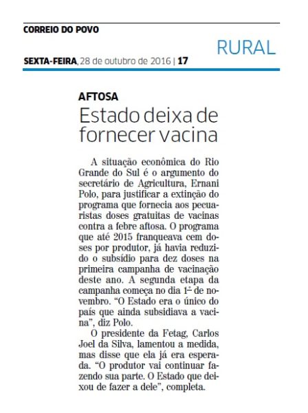 CORREIO DO POVO | RURAL | PÁGINA 17 A situação econômica do Rio Grande do Sul é o argumento do secretário de Agricultura, Ernani Polo, para justificar a extinção do programa que fornecia aos pecuaristas doses gratuitas de vacinas contra a febre aftosa. O programa que até 2015 franqueava cem doses por produtor, já havia […]