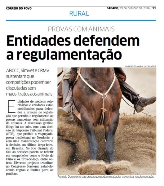 CORREIO DO POVO | RURAL | PÁGINA 11 ABCCC, Simvet e CRMV sustentam que competições podem ser disputadas sem maus-tratos aos animais Entidades de médicos veterinários e criadores estão mobilizados para defender a criação de legislação que permita e regulamente as provas campeiras com utilização de animais. A discussão ganhou fôlego há um mês, com […]