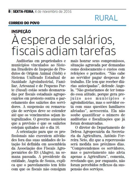 CORREIO DO POVO | RURAL | PÁGINA 8 Auditorias em propriedades e municípios vinculados ao Sistema Brasileiro de Inspeção de Produtos de Origem Animal (Sisbi) e Sistema Unificado Estadual de Sanidade Agroindustrial, Familiar, Artesanal e de Pequeno Porte (Susaf) estão sendo desmarcadas por fiscais estaduais agropecuários em protesto contra o parcelamento dos salários dos servidores. […]