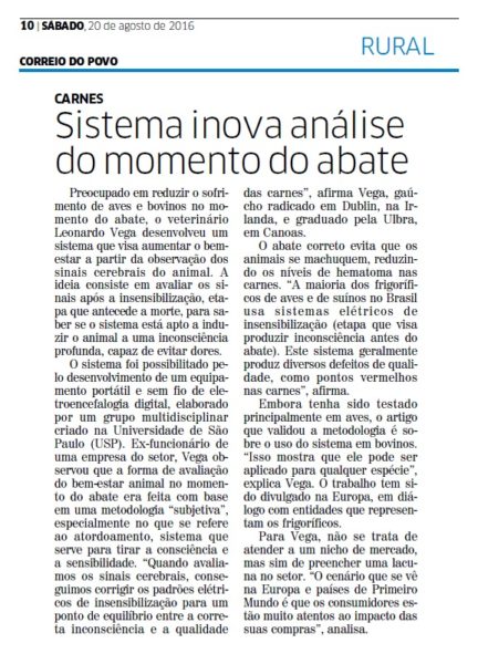 CORREIO DO POVO | RURAL | PÁGINA 10 Preocupado em reduzir o sofrimento de aves e bovinos no momento do abate, o veterinário Leonardo Vega desenvolveu um sistema que visa aumentar o bemestar a partir da observação dos sinais cerebrais do animal. A ideia consiste em avaliar os sinais após a insensibilização, etapa que antecede […]