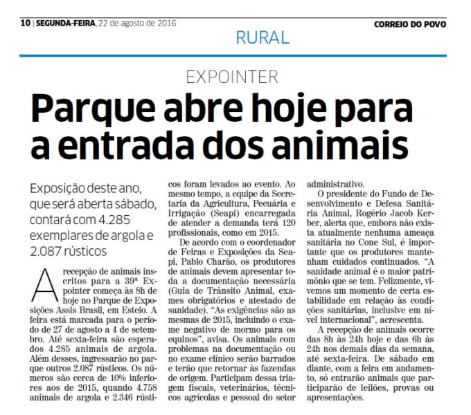 CORREIO DO POVO | RURAL | PÁGINA 10 Exposição deste ano, que será aberta sábado, contará com 4.285 exemplares de argola e 2.087 rústicos A recepção de animais inscritos para a 39ª Expointer começa às 8h de hoje no Parque de Exposições Assis Brasil, em Esteio. A feira está marcada para o período de 27 de agosto a 4 […]