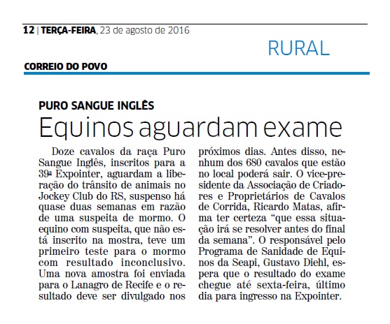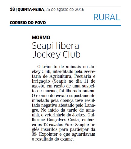 CORREIO DO POVO | RURAL | PÁGINA 18 O trânsito de animais no Jockey Club, interditado pela Secretaria de Agricultura, Pecuária e Irrigação (Seapi) no dia 11 de agosto, em razão de uma suspeita de mormo, foi liberado ontem. O exame do cavalo supostamente infectado pela doença teve resultado negativo atestado pelo Lanagro. No início da tarde de amanhã, o veterinário do Jockey, Guilherme Gonçalves Costa, […]
