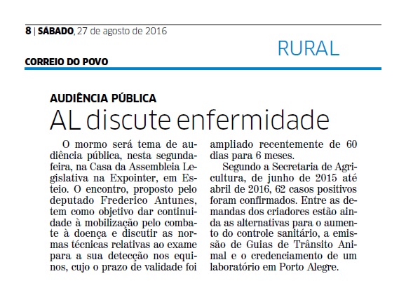 CORREIO DO POVO | RURAL | PÁGINA 8 O mormo será tema de audiência pública, nesta segunda-feira, na Casa da Assembleia Legislativa na Expointer, em Esteio. O encontro, proposto pelo deputado Frederico Antunes, tem como objetivo dar continuidade à mobilização pelo combate à doença e discutir as normas técnicas relativas ao exame para a sua […]