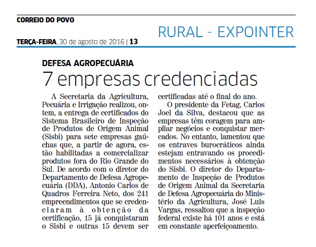 CORREIO DO POVO | RURAL – EXPOINTER | PÁGINA 13 A Secretaria da Agricultura, Pecuária e Irrigação realizou, ontem, a entrega de certificados do Sistema Brasileiro de Inspeção de Produtos de Origem Animal (Sisbi) para sete empresas gaúchas que, a partir de agora, estão habilitadas a comercializar produtos fora do Rio Grande do Sul. De […]