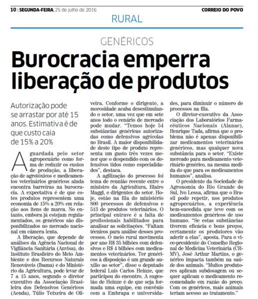 CORREIO DO POVO | RURAL | PÁGINA 10 Autorização pode se arrastar por até 15 anos. Estimativa é de que custo caia de 15% a 20% Aguardada pelo setor agropecuário como forma de reduzir os custos de produção, a liberação de agrotóxicos e medicamentos veterinários genéricos ainda encontra barreiras na burocracia. A expectativa é de que estes produtos representem […]