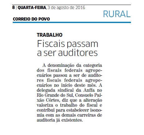 CORREIO DO POVO | RURAL | PÁGINA 8 A denominação da categoria dos fiscais federais agropecuários passou a ser de auditores fiscais federais agropecuários no início deste mês. A delegada sindical da Anffa no Rio Grande do Sul, Consuelo Paixão Côrtes, diz que a alteração valoriza o trabalho do fiscal e contribui para estabelecer isonomia […]