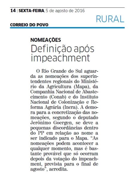 CORREIO DO POVO | RURAL | PÁGINA 14 O Rio Grande do Sul aguarda as nomeações dos superintendentes regionais do Ministério da Agricultura (Mapa), da Companhia Nacional de Abastecimento (Conab) e do Instituto Nacional de Colonização e Reforma Agrária (Incra). A demora para a concretização das nomeações, segundo o deputado Jerônimo Goergen, se deve a […]