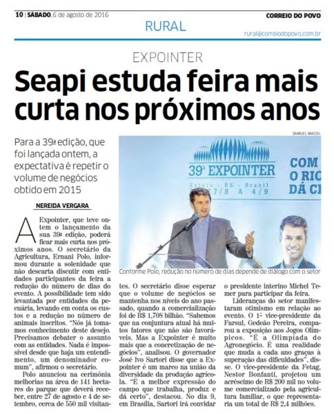 CORREIO DO POVO | RURAL | PÁGINA 10 Para a 39ª edição, que foi lançada ontem, a expectativa é repetir o volume de negócios obtido em 2015 A Expointer, que teve ontem o lançamento da sua 39ª edição, poderá ficar mais curta nos próximos anos. O secretário da Agricultura, Ernani Polo, informou durante a solenidade que não descarta discutir […]