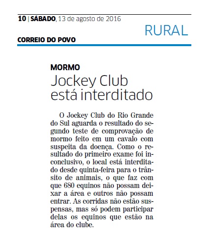 CORREIO DO POVO | RURAL | PÁGINA 10 O Jockey Club do Rio Grande do Sul aguarda o resultado do segundo teste de comprovação de mormo feito em um cavalo com suspeita da doença. Como o resultado do primeiro exame foi inconclusivo, o local está interditado desde quinta-feira para o trânsito de animais, o que […]