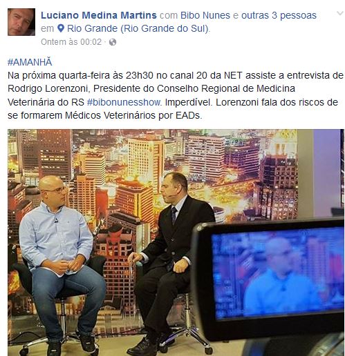 FACEBOOK Na próxima quarta-feira às 23h30 no canal 20 da NET terá entrevista de Rodrigo Lorenzoni, Presidente do Conselho Regional de Medicina Veterinária do RS. Lorenzoni fala dos riscos de se formarem Médicos Veterinários por EADs. Clique aqui para ver a matéria na página.