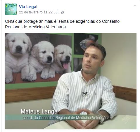 FACEBOOK | VIA LEGAL ONG que protege animais é isenta de exigências do Conselho Regional de Medicina Veterinária. Clique aqui para ver a matéria na página.