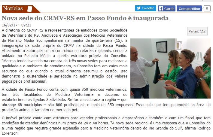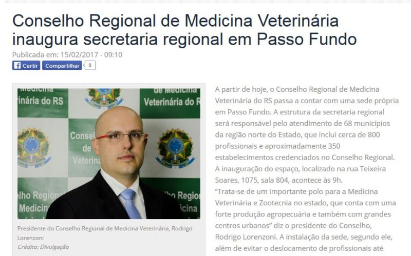 15/02/2017 – Jornal O Nacional: Conselho Regional de Medicina Veterinária inaugura secretaria regional em Passo Fundo