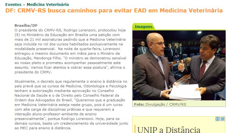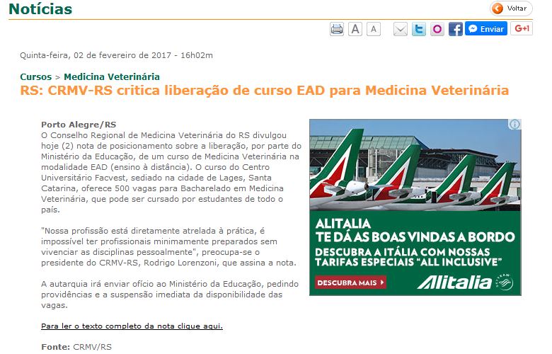 02/02/2017 – Página Rural: RS: CRMV-RS critica liberação de curso EAD para Medicina Veterinária