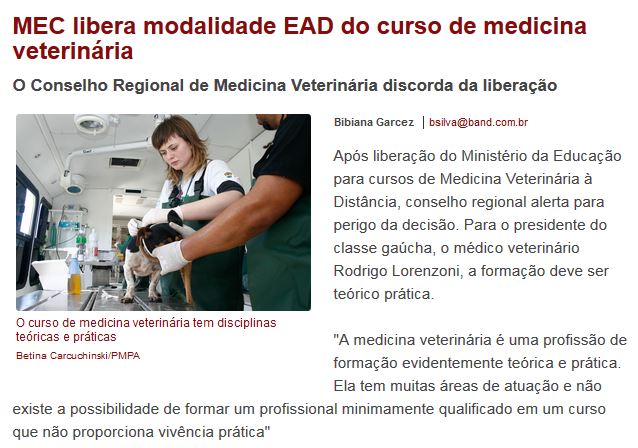BAND | NOTÍCIAS | ONLINE Após liberação do Ministério da Educação para cursos de Medicina Veterinária à Distância, conselho regional alerta para perigo da decisão. Para o presidente do classe gaúcha, o médico veterinário Rodrigo Lorenzoni, a formação deve ser teórico prática. “A medicina veterinária é uma profissão de formação evidentemente teórica e prática. Ela […]