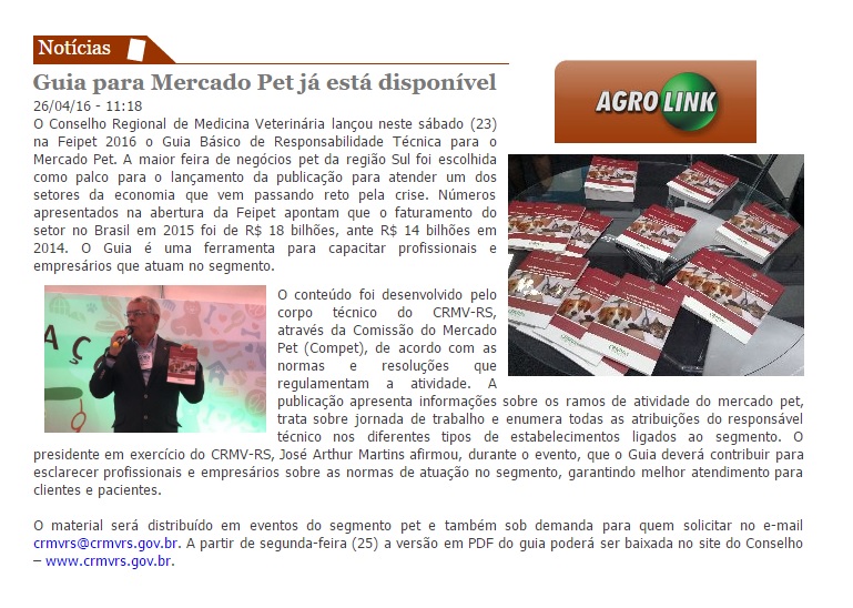 AGROLINK | ONLINE O Conselho Regional de Medicina Veterinária lançou neste sábado (23) na Feipet 2016 o Guia Básico de Responsabilidade Técnica para o Mercado Pet. A maior feira de negócios pet da região Sul foi escolhida como palco para o lançamento da publicação para atender um dos setores da economia que vem passando reto […]