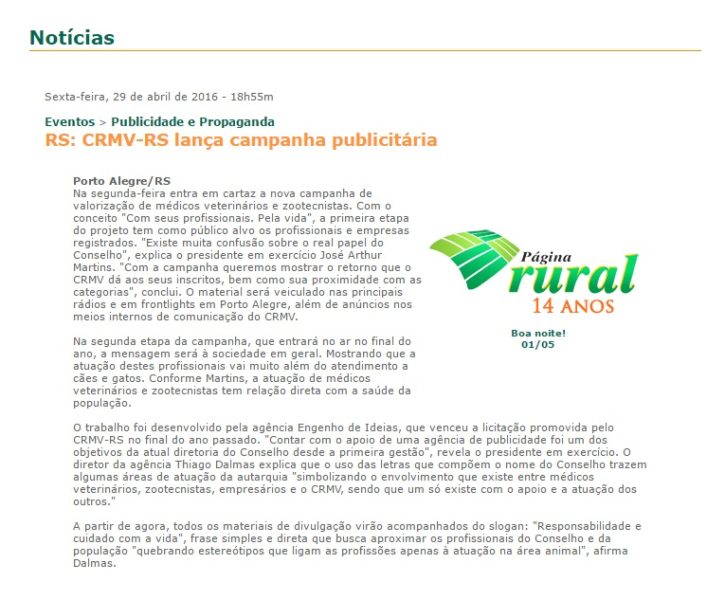 29/04/2016 – Página Rural: CRMV-RS lança campanha publicitária