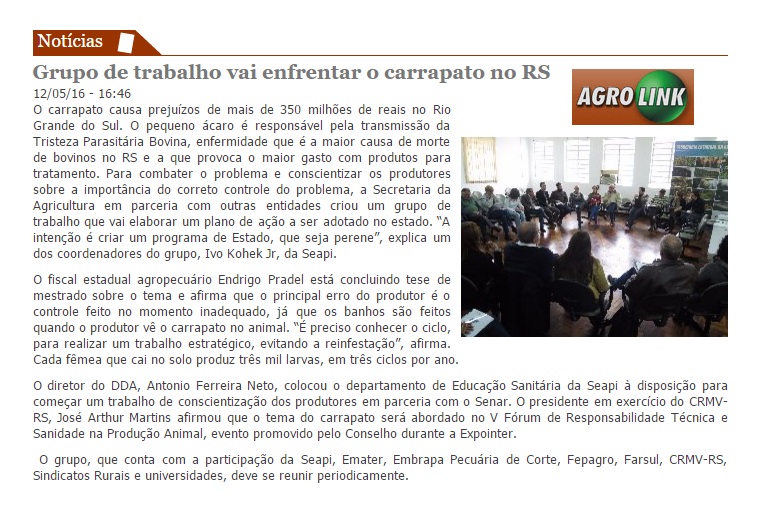 12/05/2016 – Agrolink: Grupo de trabalho vai enfrentar o carrapato no RS