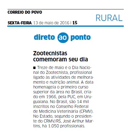 CORREIO DO POVO | RURAL | PÁGINA 15 Treze de maio é o Dia Nacional do Zootecnista, profissional ligado às atividades de melhoramento e nutrição animal. A data homenageia o primeiro curso superior da área no Brasil, criado em 1966, pela PUC, em Uruguaiana. No Brasil, são 14 mil inscritos no Conselho Federal de Medicina […]