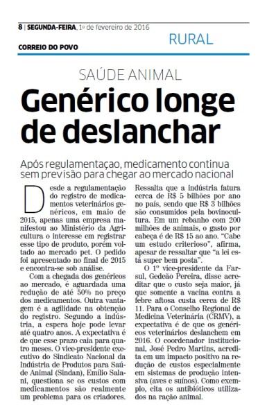 CORREIO DO POVO | RURAL | PÁGINA 8 Após regulamentação, medicamento continua sem previsão para chegar ao mercado nacional Desde a regulamentação do registro de medicamentos veterinários genéricos, em maio de 2015, apenas uma empresa manifestou ao Ministério da Agricultura o interesse em registrar esse tipo de produto, porém voltado ao mercado pet. O pedido foi […]