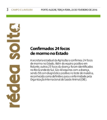 23/02/2016 – ZH: Confirmados 24 focos de mormo no Estado