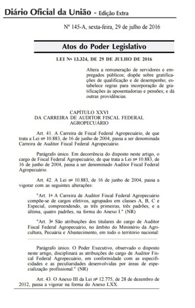29/07/2016 – Diário Oficial da União: Altera denominação de FFA para Auditor Fiscal Federal Agropecuário AFFA