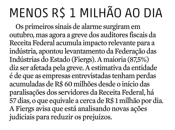ZERO HORA | ECONOMIA | PÁGINA 24 Os primeiros sinais de alarme surgiram em outubro, mas agora a greve dos auditores fiscais da Receita Federal acumula impacto relevante para a indústria, apontou levantamento da Federação das Indústrias do Estado (Fiergs). A maioria (87,5%) diz ser afetada pela greve. A estimativa da entidade é de que […]