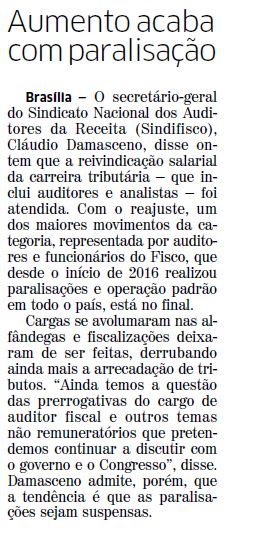 JORNAL CORREIO DO POVO | ECONOMIA | PÁGINA 6 Brasília — O secretário-geral do Sindicato Nacional dos Auditores da Receita (Sindifisco), Cláudio Damasceno, disse ontem que a reivindicação salarial da carreira tributária — que inclui auditores e analistas — foi atendida. Com o reajuste, um dos maiores movimentos da categoria, representada por auditores e funcionários […]