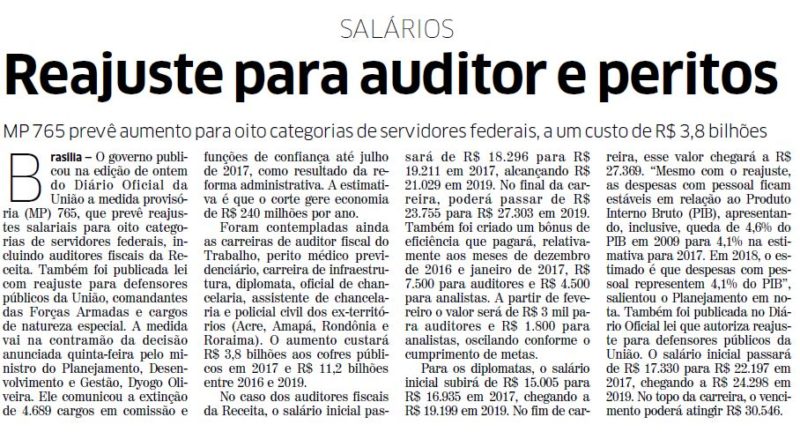 JORNAL CORREIO DO POVO | ECONOMIA | PÁGINA 6 Brasília — O governo publicou na edição de ontem do Diário Oficial da União a medida provisória (MP) 765, que prevê reajustes salariais para oito categorias de servidores federais, incluindo auditores fiscais da Receita. Também foi publicada lei com reajuste para defensores públicos da União, comandantes […]