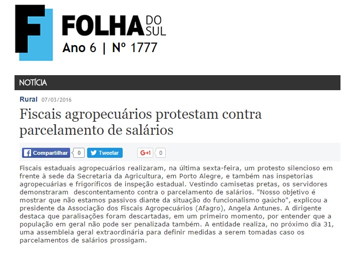 07/03/2016 – Folha do Sul: Fiscais agropecuários protestam contra parcelamento de salários