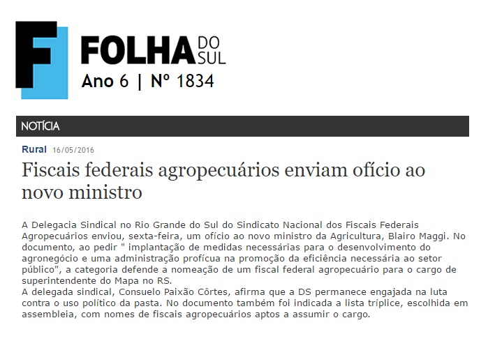 16/05/2016 – Folha do Sul: Fiscais federais agropecuários enviam ofício ao novo ministro