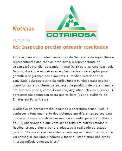 COTRIROSA | ONLINE Ao falar para autoridades, servidores da Secretaria da Agricultura e representantes das cadeias produtivas, o representante da Organização Mundial de Saúde Animal (OIE) para as Américas, Luis Barcos, disse que os países e regiões precisam se adaptar para garantir a segurança dos alimentos. O médico veterinário foi convidado pela Secretaria da Agricultura […]