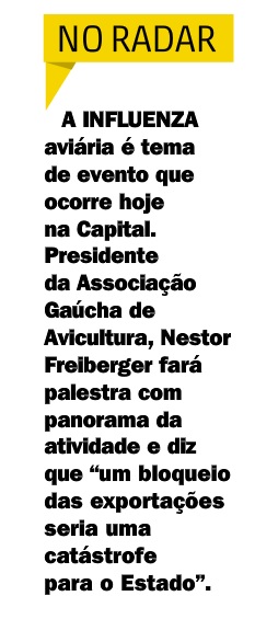 JORNAL ZERO HORA | CAMPO ABERTO | PÁGINA 15 A Influenza aviária é tema de evento que ocorre hoje na Capital. Presidente da Associação Gaúcha de Avicultura, Nestor Freiberger fará palestra com panorama da atividade e diz que “um bloqueio das exportações seria uma catástrofe para o Estado”. Clique aqui para ver a matéria na […]