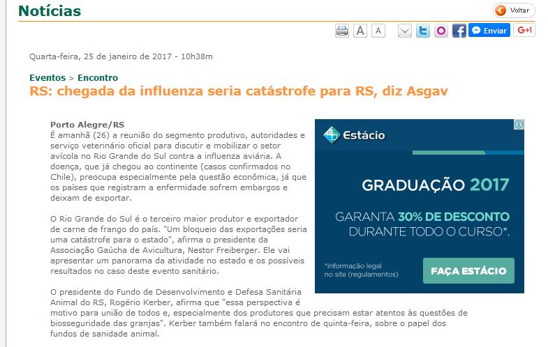 25/01/2017 – Página Rural: RS: chegada da influenza seria catástrofe para RS, diz Asgav