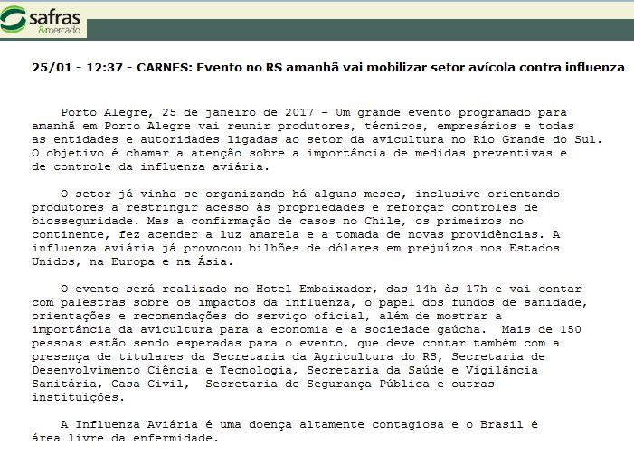 25/01/2017 – Safras&Mercado: CARNES: Evento no RS amanhã vai mobilizar setor avícola contra influenza