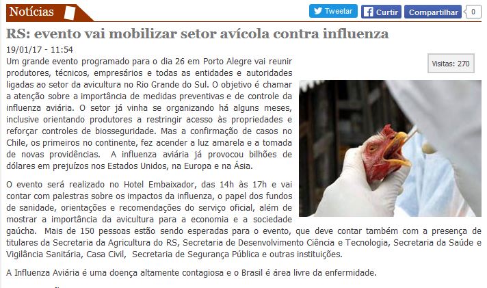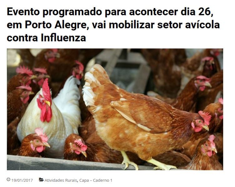 19/01/2017 – O Sul: Evento programado para acontecer dia 26, em Porto Alegre, vai mobilizar setor avícola contra Influenza