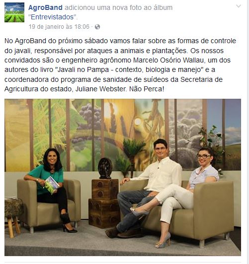 FACEBOOK | AGROBAND Formas de controle do javali, responsável por ataques a animais e plantações. Convidados são o engenheiro agrônomo Marcelo Osório Wallau, um dos autores do livro “Javali no Pampa – contexto, biologia e manejo” e a coordenadora do programa de sanidade de suídeos da Secretaria de Agricultura do estado, Juliane Webster. Clique aqui […]