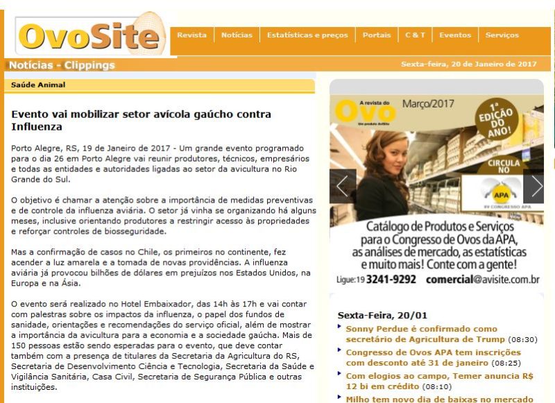 19/01/2017 – OvoSite: Evento vai mobilizar setor avícola gaúcho contra Influenza