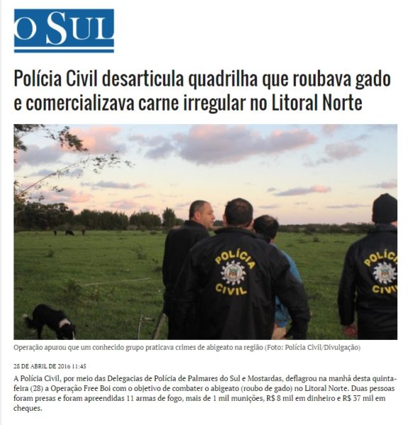 28/04/2016 – O Sul: Polícia Civil desarticula quadrilha que roubava gado e comercializava carne irregular no Litoral Norte