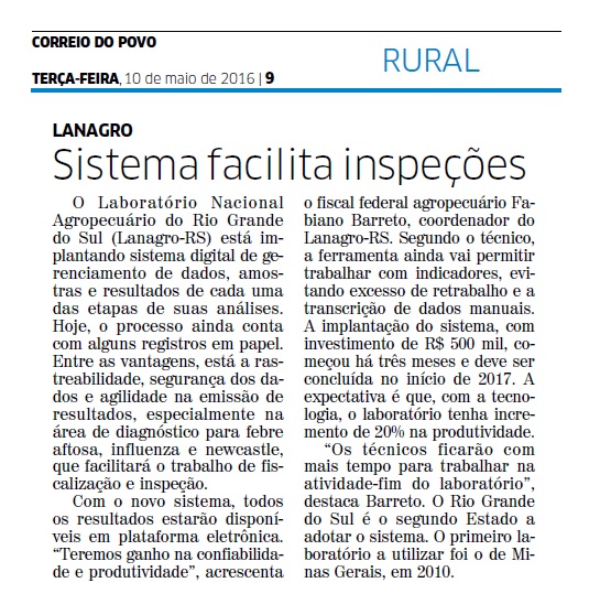 CORREIO DO POVO | RURAL | PÁGINA 9 O Laboratório Nacional Agropecuário do Rio Grande do Sul (Lanagro-RS) está implantando sistema digital de gerenciamento de dados, amostras e resultados de cada uma das etapas de suas análises. Hoje, o processo ainda conta com alguns registros em papel. Entre as vantagens, está a rastreabilidade, segurança dos […]