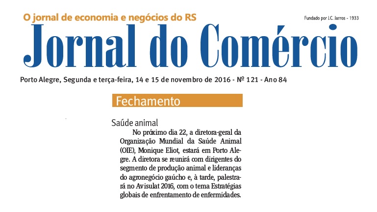 JORNAL DO COMÉRCIO | FECHAMENTO | PÁGINA 28 No próximo dia 22, a diretora-geral da Organização Mundial da Saúde Animal (OIE), Monique Eliot, estará em Porto Alegre. A diretora se reunirá com dirigentes do segmento de produção animal e lideranças do agronegócio gaúcho e, à tarde, palestrará no Avisulat 2016, com o tema Estratégias globais […]