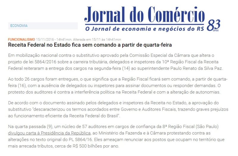 15/11/2016 – JC: Receita Federal no Estado fica sem comando a partir de quarta-feira