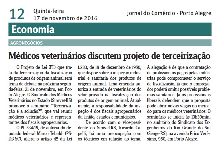 17/11/2016 – JC: Médicos veterinários discutem projeto de terceirização